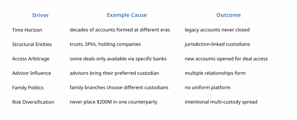 This produces a natural proliferation of custodians. And Family Offices do not “fix” sprawl because the cost, tax friction, and loss of access involved in unwinding legacy accounts is often worse than simply tolerating the fragmentation. The outcome is multi-custody as a permanent operating state.